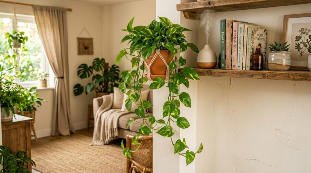 It’s incredibly easy to grow, visually appealing, and highly effective at purifying the air. With its trailing vines and heart-shaped leaves, it adds a natural, flowing look to shelves, walls, or hanging pots.